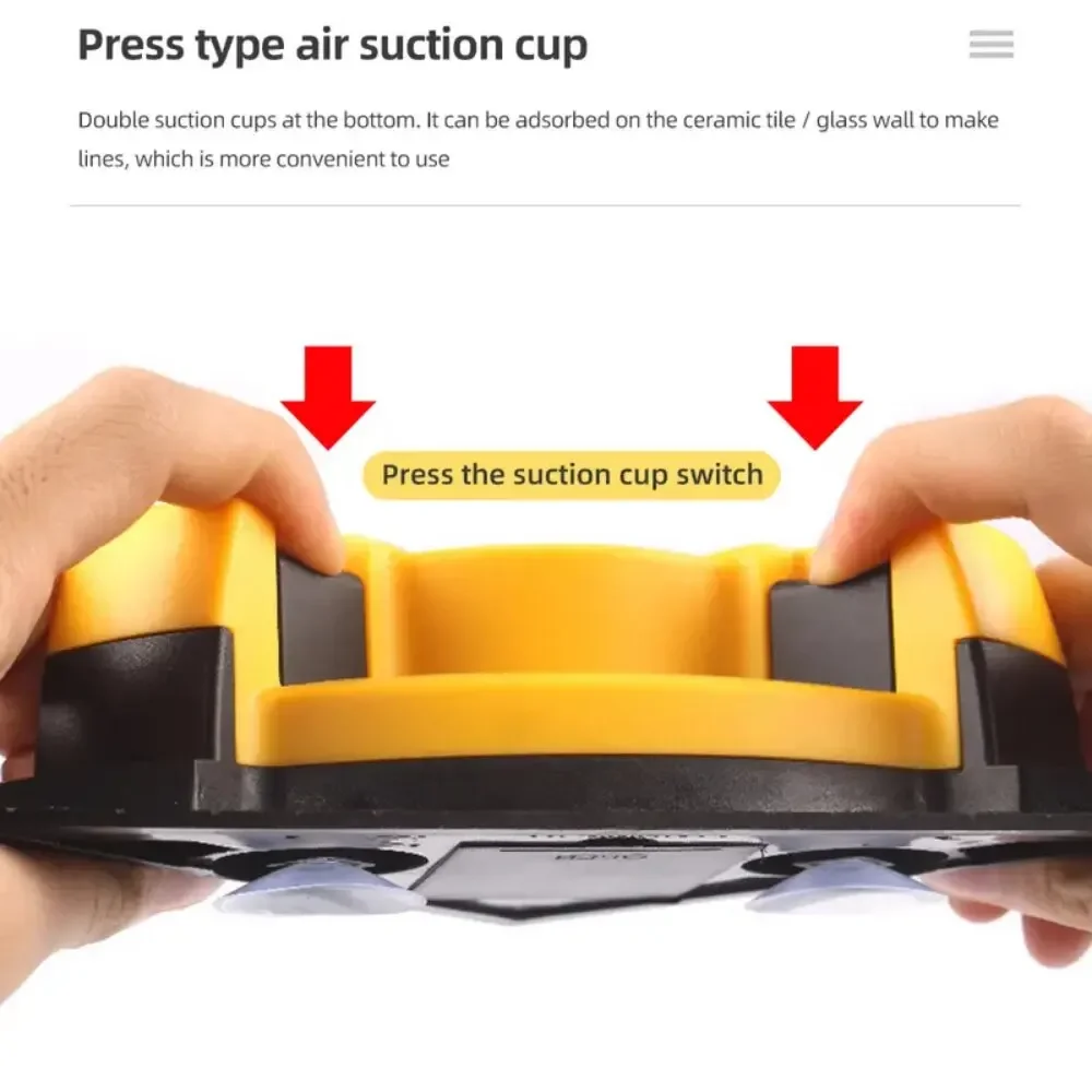 Two suction cups allow the level square to be mounted onto the smooth surfaces (like clean glass and ceramic tile) with an alignment guide for 90-degree layout calculation.