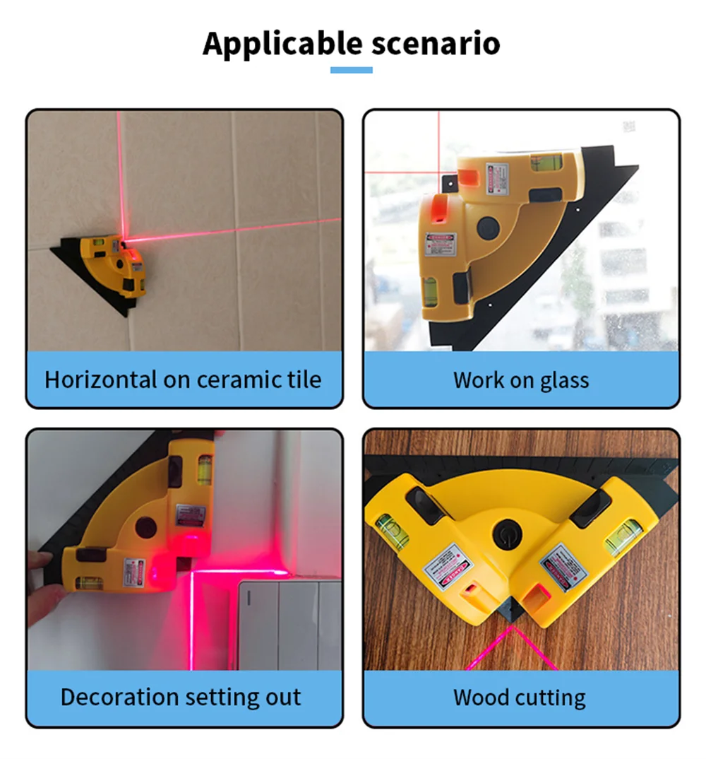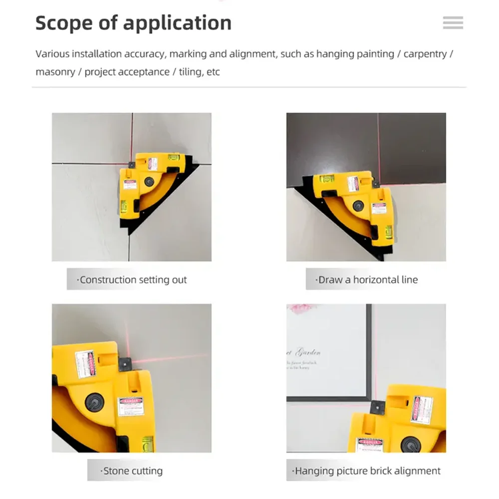 Handy and compact laser level tool that can generate two lines on the floor, wall, or other surfaces at 90-degree angles to help you square, align and angle at 90 degrees for surface layout including tile, picture, stone, brick, carpet, hardwood flooring and more.